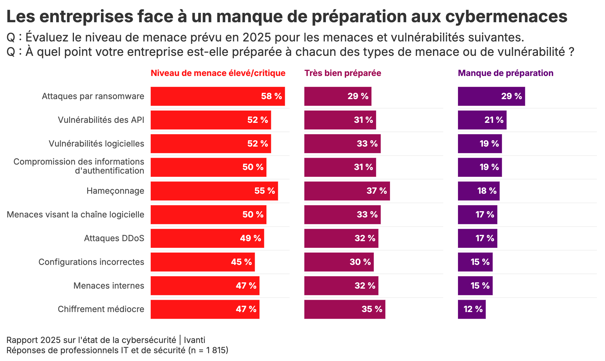 Basée sur les réponses de plus de 2 400 cadres dirigeants et professionnels de la cybersécurité, cette étude met en évidence les menaces de cybersécurité les plus critiques du moment. Il en ressort que les ransomwares constituent la menace la plus probable pour 2025. Un constat d'autant plus inquiétant que plus d'un tiers (38%) des experts interrogés estiment que l'intelligence artificielle aggravera encore cette menace.
