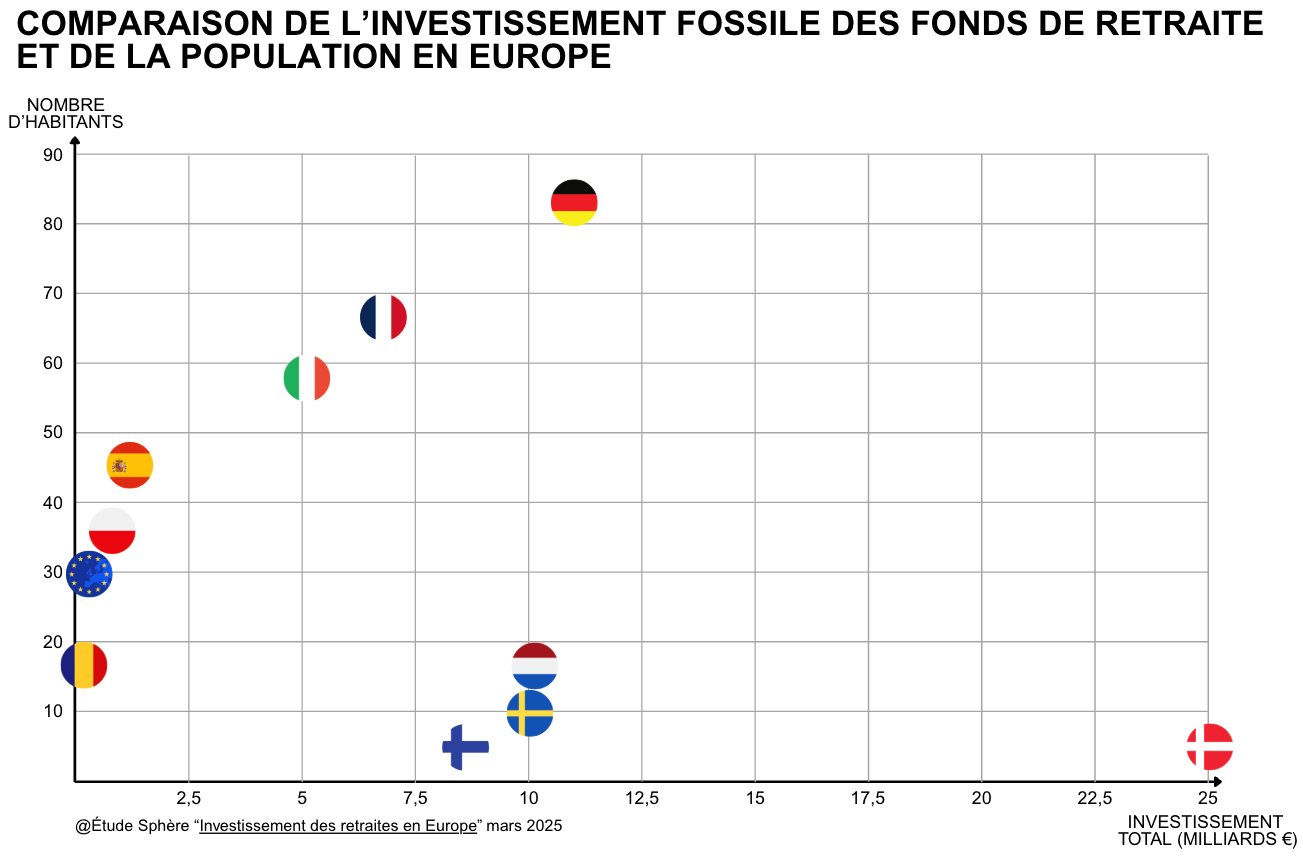 Dans les pays où les pensions sont largement capitalisées, comme les Pays-Bas, le Danemark, la Suède et la Finlande, le citoyen moyen a plusieurs milliers d’euros de ses économies de retraite investis dans des actions et obligations liées aux énergies fossiles. Dans d’autres pays, comme la France et l’Allemagne, ce montant est plus faible (quelques centaines d’euros ou moins) car les pensions d’État sont principalement basées sur le système de répartition, bien que les plans complémentaires et les fonds de réserve de retraite de ces pays investissent dans les énergies fossiles.