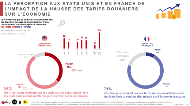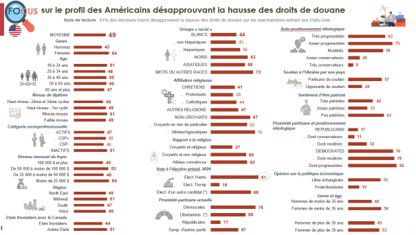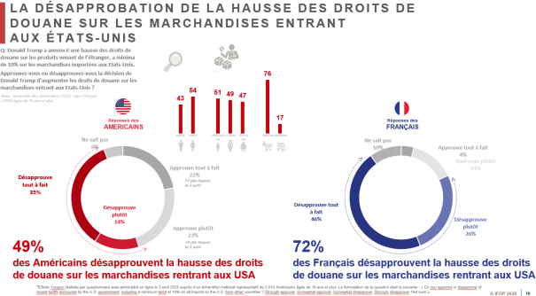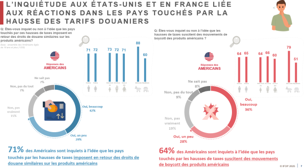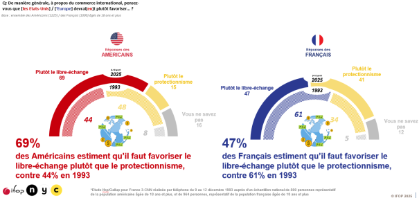 Le point de vue de François Kraus de l'Ifop, Directeur du Pôle Politique & Actualités / Cette étude témoigne d'une réelle inquiétude concernant les effets économiques des hausses tarifaires décidées par l'administration Trump, tant aux États-Unis qu'en France, mais révèle aussi un paysage d'opinions traversé de paradoxes. Si ces mesures protectionnistes suscitent des craintes légitimes concernant l'inflation et les risques de représailles commerciales, elles s'inscrivent dans un contexte où les Américains ont, paradoxalement, développé un attachement croissant aux principes du libre-échange.