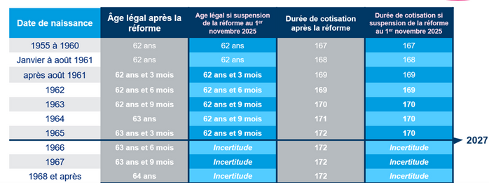 Tableau récapitulatif des âges légaux et durées d’assurance envisagées.