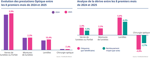 • Le poste optique se distingue par trois composantes principales : les montures, les verres et les lentilles. Les coûts de remboursement des montures sont en légère augmentation de 2,2% par rapport à 2024. Les verres, quant à eux, subissent une augmentation de 1,5%. Enfin, les lentilles, qui ont acquis ces dernières années une grande popularité, accusent une dérive de plus de 10%.