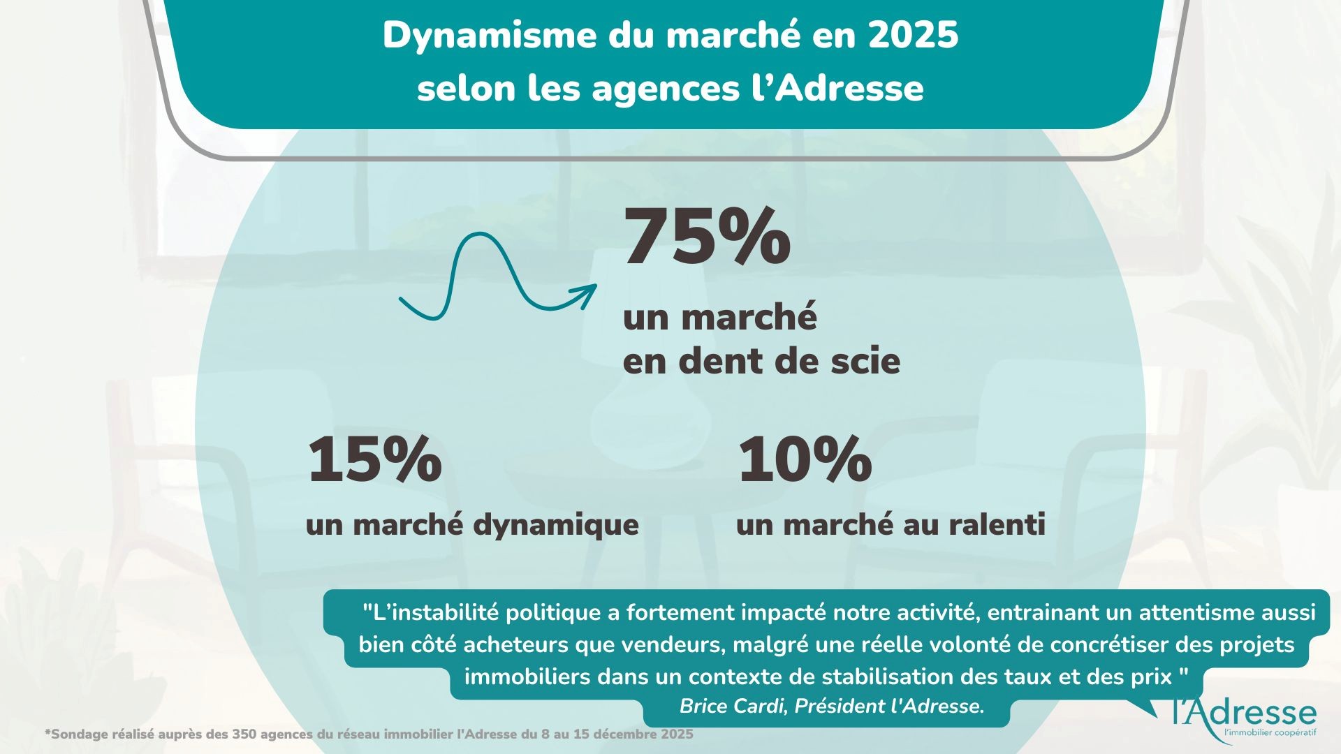 Si le réseau l’Adresse constate une réelle reprise du marché en 2025 avec au global, une hausse des compromis signés de 10% par rapport à 2024, celle-ci a été marquée par une forte irrégularité. Comme en témoigne les résultats du sondage, si 15% des agences jugent le marché dynamique en 2025, selon 75% d’entre elle, il a été en « dent de scie », alternant périodes de reprise ponctuelle et phases de ralentissement marqué. Selon 10% des agences, il a même tourné au ralenti.