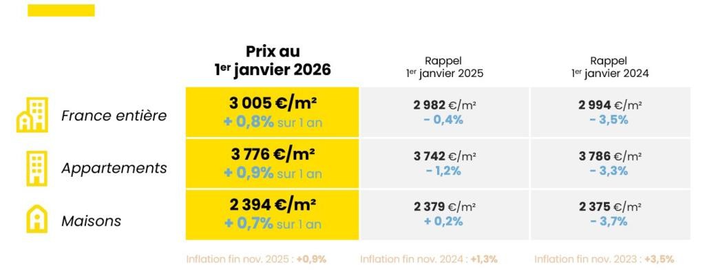 Après une baisse marquée en 2023 (-3,5% sur douze mois glissants), puis une quasi-stabilité en 2024 (-0,4%), les prix des logements anciens enregistrent une légère progression en 2025. Au 1er janvier 2026, ils augmentent de +0,8% sur un an, soit un rythme comparable à celui de l’inflation (+0,9%).