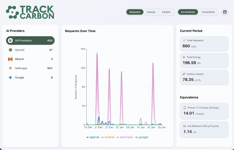 La Fondation Sahar et l’association Trackarbon annoncent le lancement de TrackCarbon, une application gratuite qui permet de suivre, en continu, la consommation énergétique et l’empreinte carbone estimée des usages quotidiens de l’intelligence artificielle.